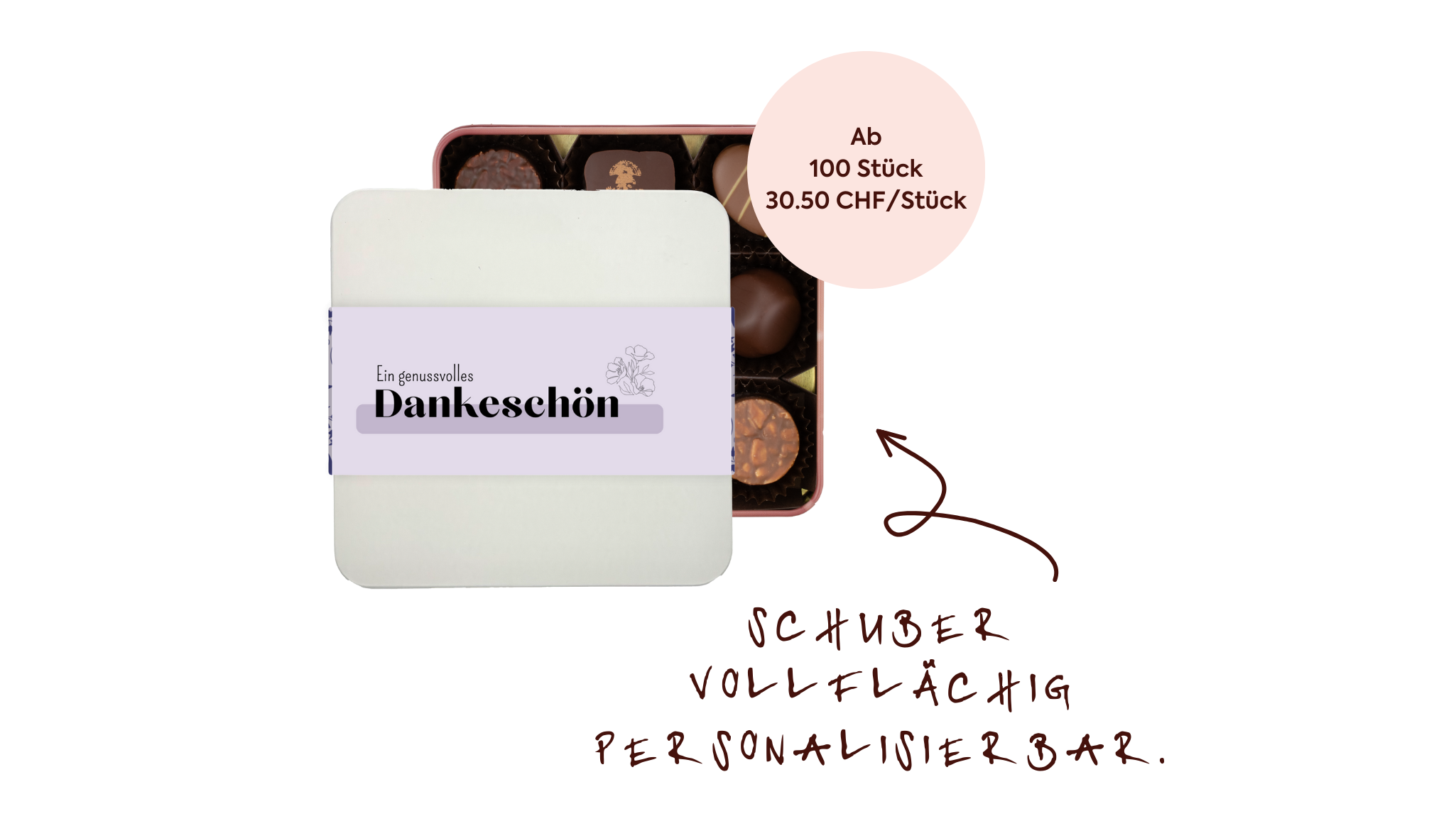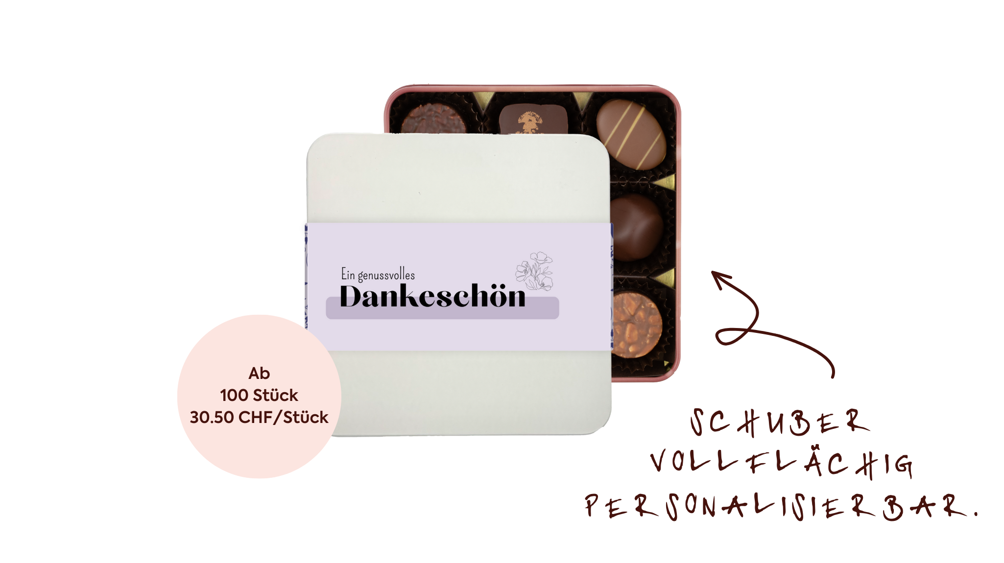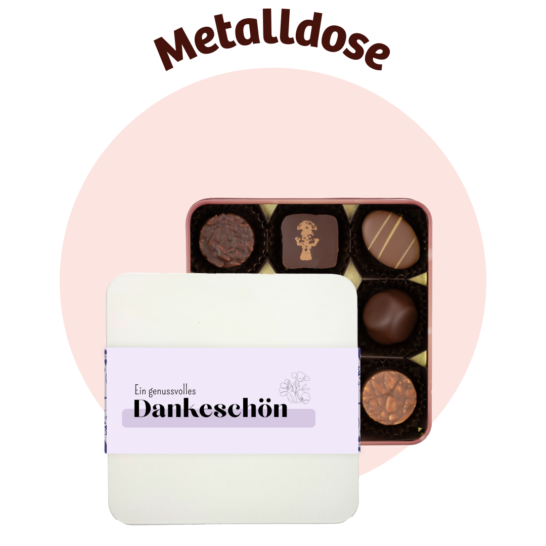 Unsere hochwertige Metalldose mit 9 Stk. assortierten Pralinés und personalisierbarem Schuber im Oster- oder Firmendesign.