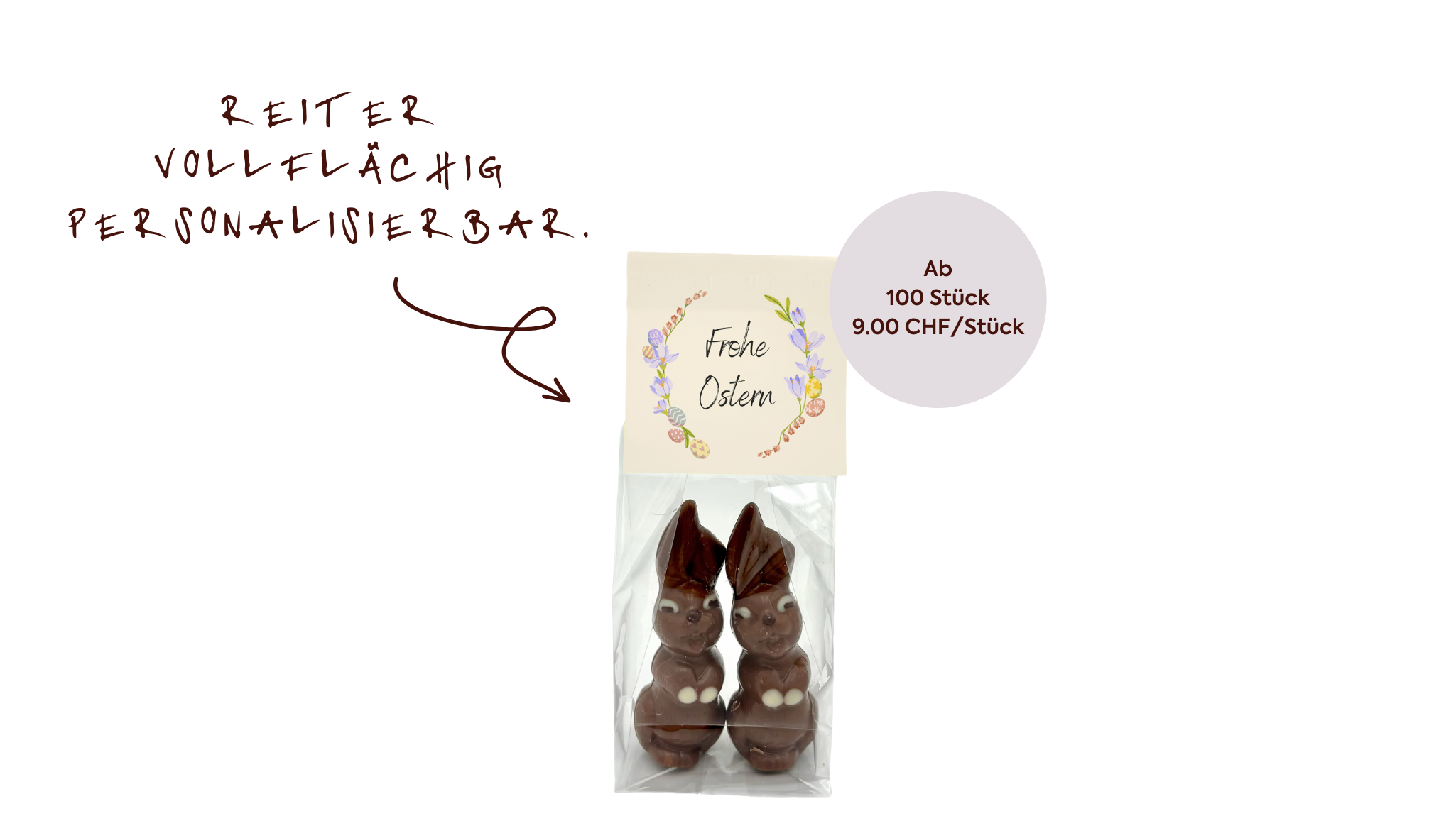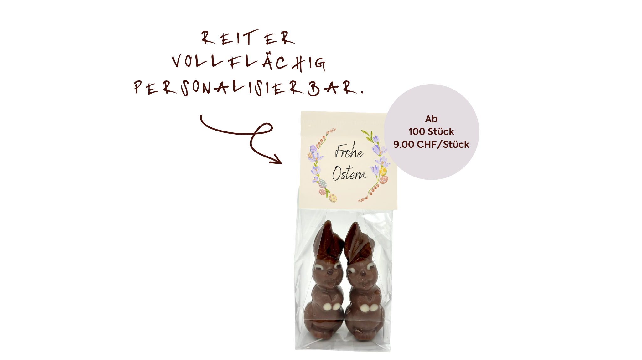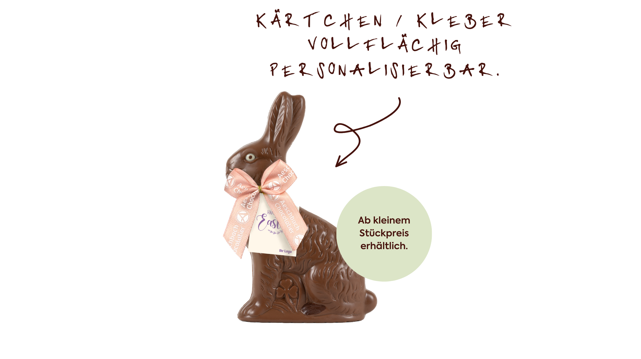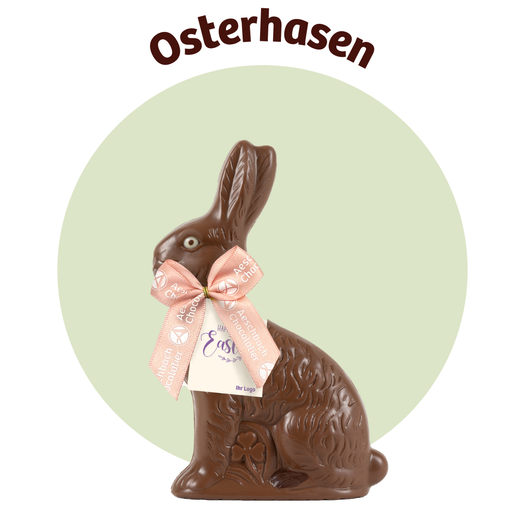 Veredelt mit Aeschbach-Schleife und individuell gestaltbarem Kärtchen oder Kleber wird der Osterhase zu einem sympathischen Firmengruss.