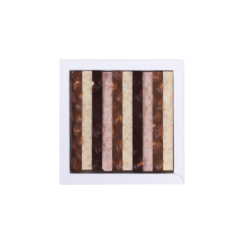 Schachtel mit Herzausschnitt und vier Sorten unserer feinen Huusschoggi im Stäbli-Format.